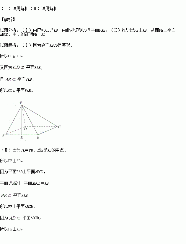 中,底面ABCD是菱形,PA=PB,且侧面PAB⊥平面ABCD,点E是AB的中点。