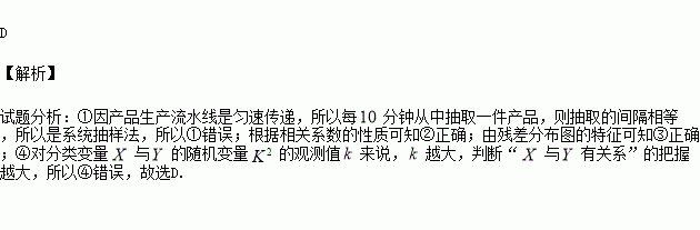 ①在匀速传递的产品生产流水线上,质检员每10分钟从中抽取一件产品进行某项指标检测,这样的抽样是分层抽样;②若两个变量的线性相关性越强,则它们的相关系数的绝对值越接近于1;③在残差图中,残差点分布的带状区域的宽度越狭窄,其模型拟合的精度越高;④对分类变量X与Y的随机变量K2的观测值k来说,k越小,判断“X与Y有关系”的把握越大.其中真命题的序号是( )