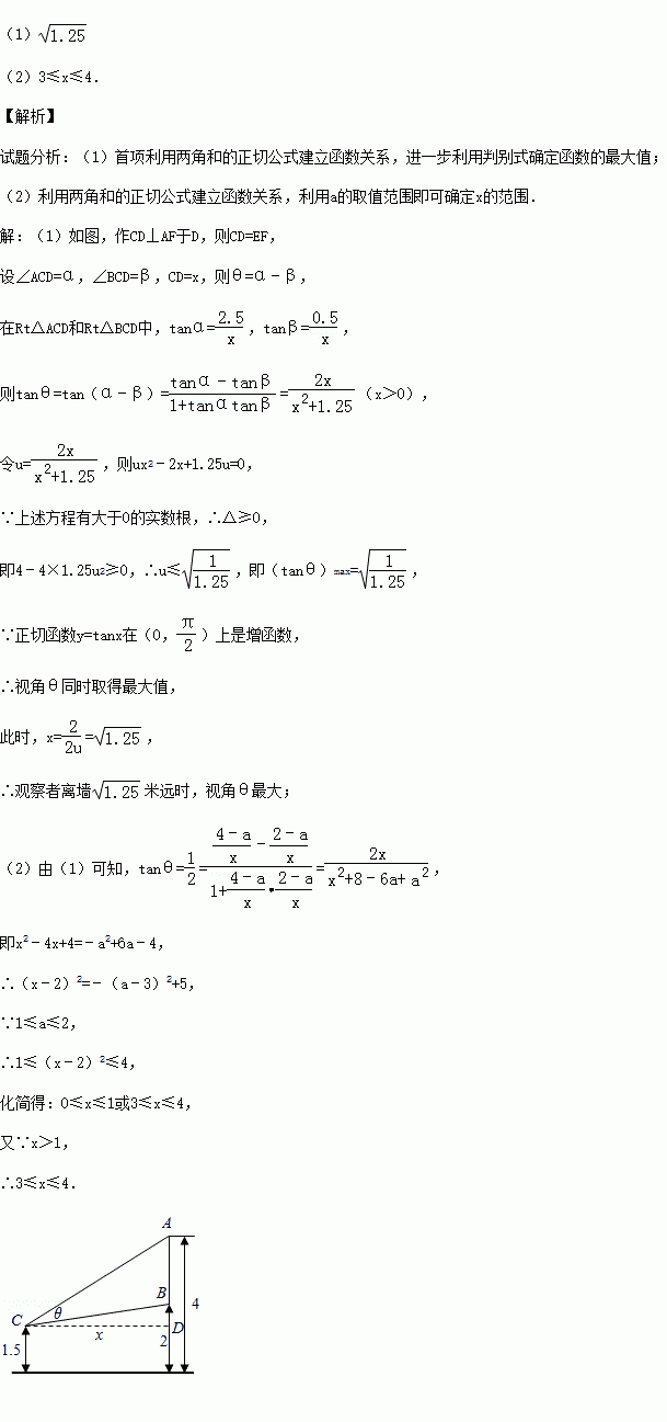 (1)若a=1.5,问:观察者离墙多远时,视角θ最大?