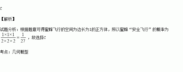 一只蜜蜂在一个棱长为3的正方体内自由飞行,若蜜蜂在飞行过程中始终保持与正方体6个表面的距离均大于1,称其为“安全飞行”,则蜜蜂“安全飞行”的概率为