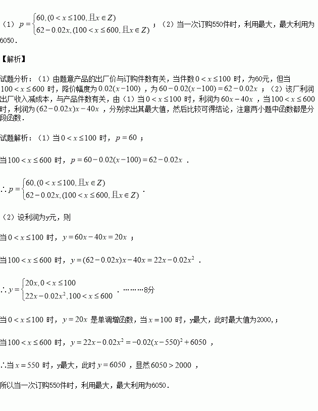 某厂生产一种产品,每件产品的成本为40元,出厂单价定为60元,该厂为鼓励销售商订购,决定当一次订购量超过100件时,每多订购一件,订购的全部产品的出场单价就降低0.02元,根据市场调查,销售商一次订购量不会超过600件.