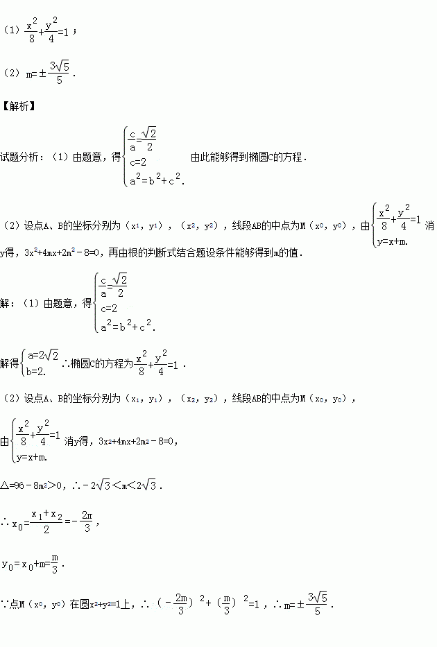 (2)若直线y=x+m与椭圆C交于不同的两点A,B,且线段的中点M在圆x2+y2=1上,求m的值.