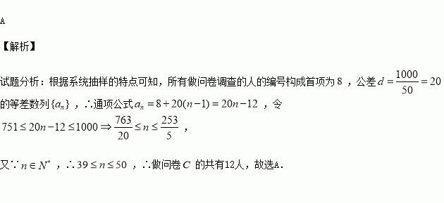 采用系统抽样方法从1000人抽取50人做问卷调查,将他们随机编号1,2,…,1000. 适当分组后在第一组采用简单随机抽样的方法抽到的号码为8. 若抽到的50人中,编号落入区间