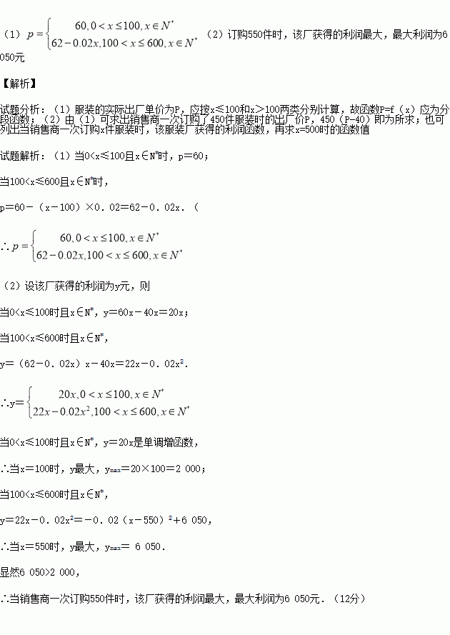 某服装厂生产一种服装,每件服装的成本为40元,出厂单价定为60元.该厂为鼓励销售商订购,决定当一次订购量超过100件时,每多订购1件,订购的全部服装的出场单价就降低0.02元,根据市场调查,销售商一次订购量不会超过600件.