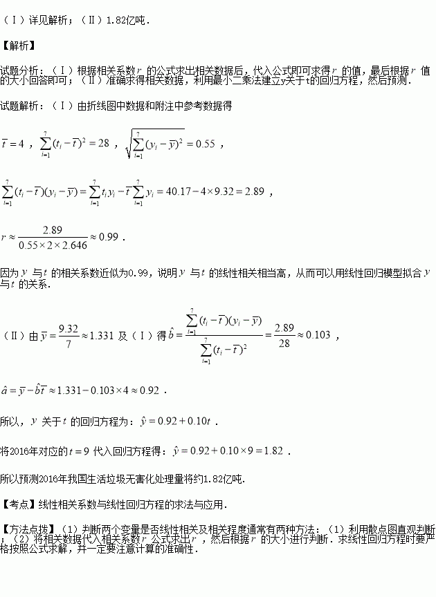 (Ⅱ)建立y关于t的回归方程(系数精确到0.01),预测2016年我国生活垃圾无害化处理量.