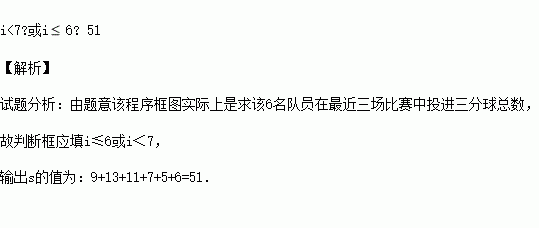 下图是统计该6名队员在最近三场比赛中投进的三分球总数的程序框图,则图中判断框应填 ,输出的s= .