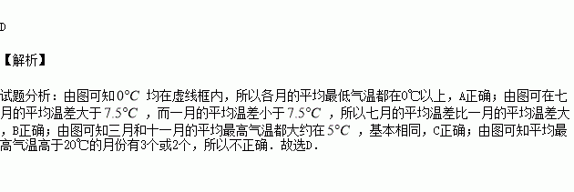 某旅游城市为向游客介绍本地的气温情况,绘制了一年中月平均最高气温和平均最低气温的雷达图。图中A点表示十月的平均最高气温约为150C,B点表示四月的平均最低气温约为50C。下面叙述不正确的是