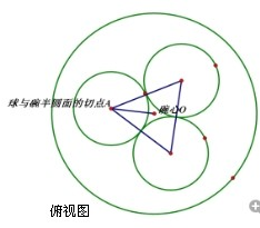 则俯视图中,球心O(也是圆心O)是三个小球与半圆面的三个切点的中心,