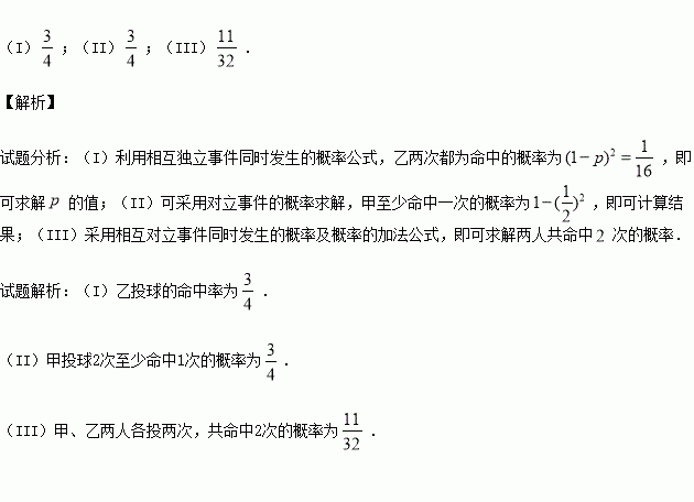 (III)若甲、乙两人各投球2次,求两人共命中2次的概率.