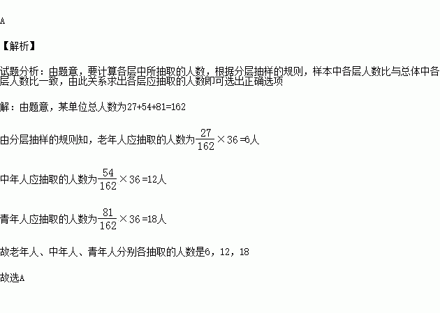 (2014秋•铜陵期末)某单位有老年人27人,中年人54人,青年人81人,为了调查他们的身体状况的某项指标,需从他们中间抽取一个容量36样本,则老年人、中年人、青年人分别各抽取的人数是( )