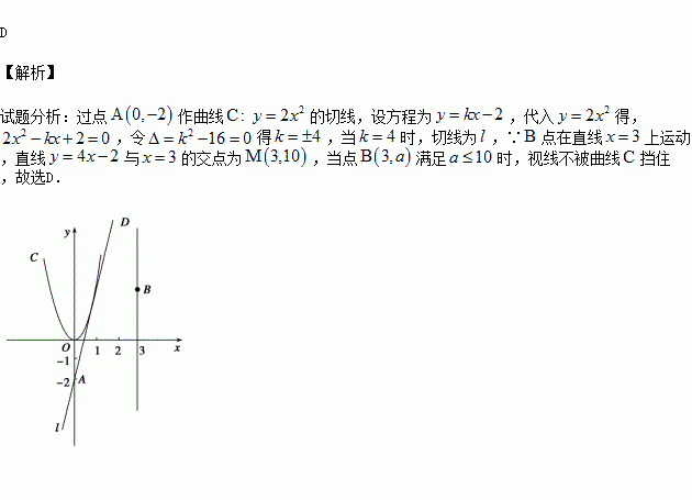 已知曲线C:y=2x2,点A(0,-2)及点B(3,a),从点A观察点B,要使视线不被曲线C挡住,则实数a的取值范围是( )