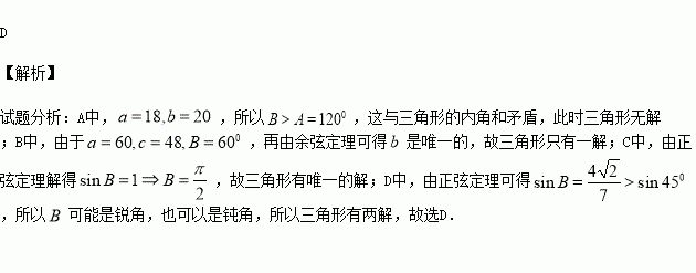 △ABC中,根据下列条件,能确定△ABC有两解的是( )