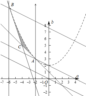 则$\left\{\begin{array}{l}{△={a}^{2}-4(b-2)>0}\\{f(1)=a+b-1≥0}\\{f(3)=3a+b+7≥0}\\{1<-\frac{a}{2}<3}\end{array}\right.$,即$\left\{\begin{array}{l}{4b<{a}^{2}+8}\\{a+b-1≥0}\\{3a+b+7≥0}\\{-6<a<-2}\end{array}\right.$,
