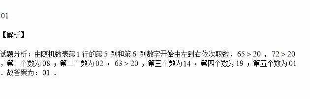 总体编号为01,02,…19,20的20个个体组成.利用下面的随机数表选取5个个体,选取方法是从随机数表第1行的第5列和第6列数字开始由左到右依次选 取两个数字,则选出来的第5个个体的编号为________.