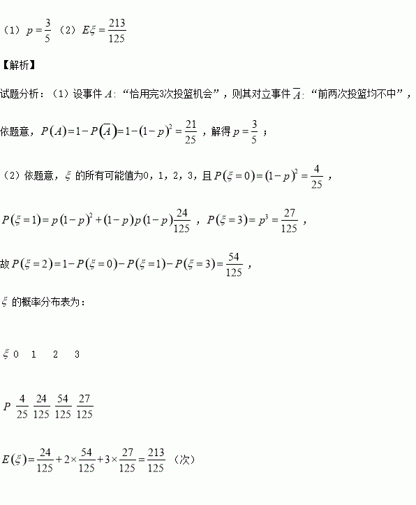.现有3次投篮机会,并规定连续两次投篮均不中即终止投篮.已知该运动员不放弃任何一次投篮机会,且恰用完3次投篮机会的概率是