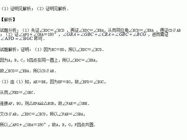 (2)延长CD到F,延长DC到G,使得EF=EG,证明:A,B,G,F四点共圆.