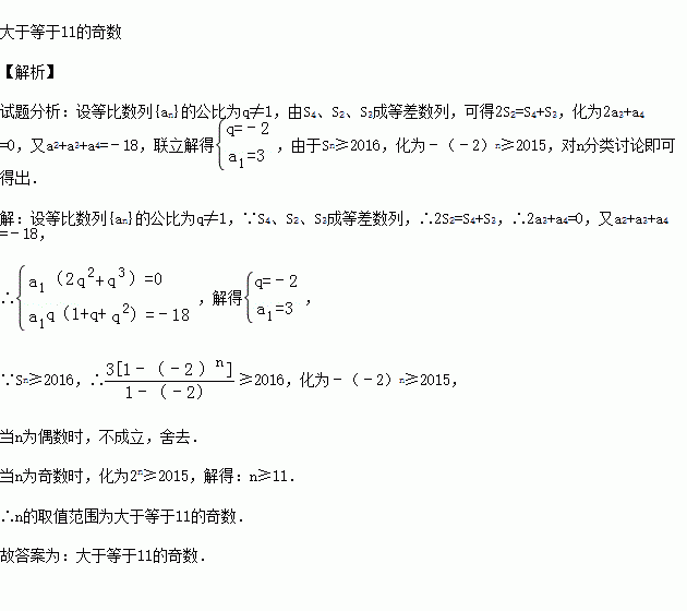(2015秋•上海月考)已知等比数列{an}的前n项和为Sn,若S4、S2、S3成等差数列,且a2+a3+a4=﹣18,若Sn≥2016,则n的取值范围为 .