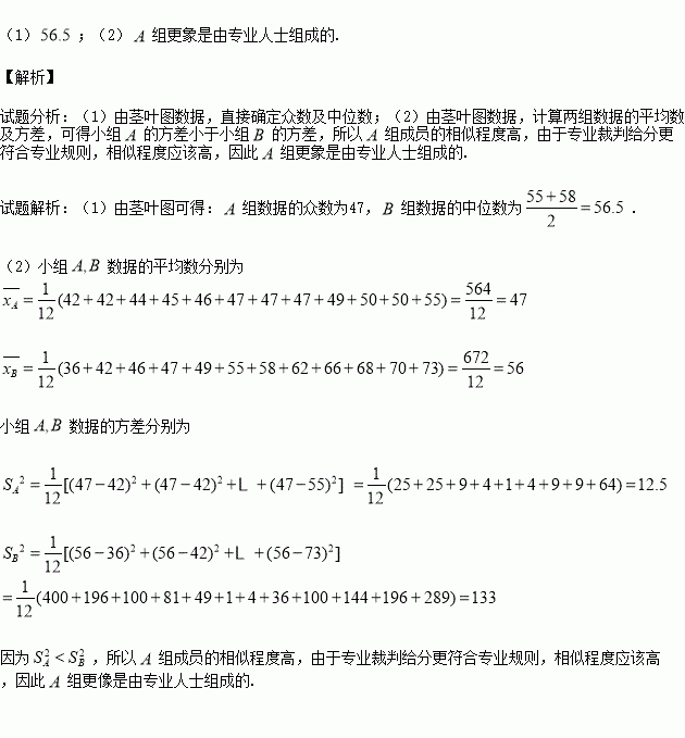 在一个文艺比赛中,12名专业人士和12名观众代表各组成一个评判小组,给参赛选手打分,如图是两个评判组对同一选手打分的茎叶图:
