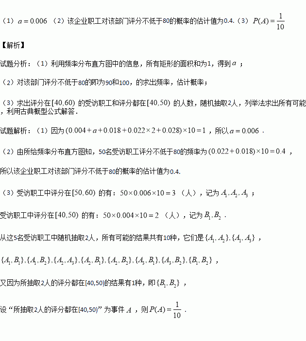 某企业为了解下属某部门对本企业职工的服务情况,随机访问50名职工,根据这50名职工对该部门的评分,绘制频率分布直方图(如图所示),其中样本数据分组区间为![]()