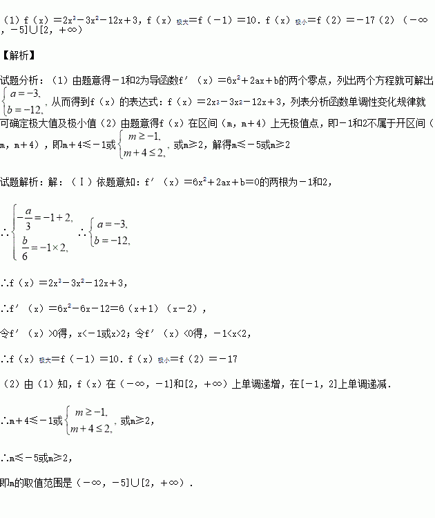 (本小题满分12分)已知函数f(x)=2x3+ax2+bx+3在x=-1和x=2处取得极值.
