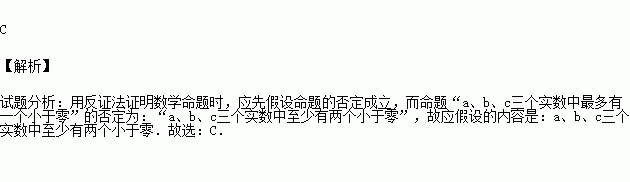 用反证法证明命题“若a+b+c≥0,abc≤0,则a、b、c三个实数中最多有一个小于零”的反设内容为( )