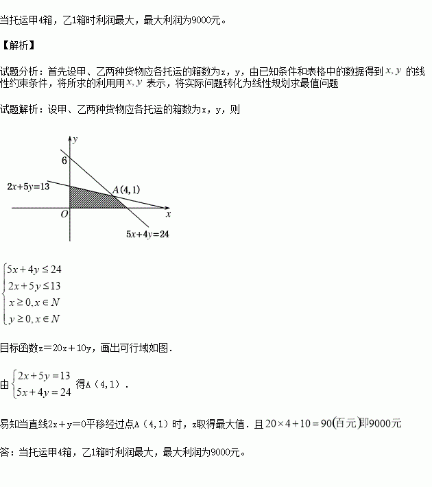 (本小题满分12分)某厂拟用集装箱托运甲、乙两种货物,集装箱的体积、重量、可获利润和托运能力等限制数据列在下表中,如何设计甲、乙两种货物应各托运的箱数可以获得最大利润,最大利润是多少?.