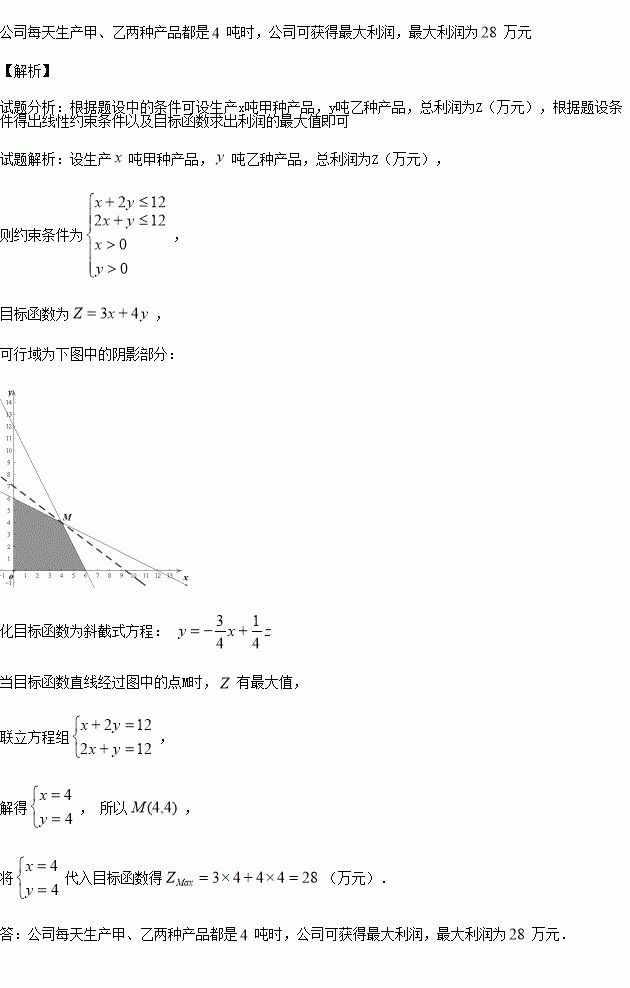 公司在生产这两种产品的计划中,要求每种产品每天消耗A、B原料都不超过12吨.求每天生产甲、乙两种产品各多少吨,使公司获得总利润最大?最大利润是多少?