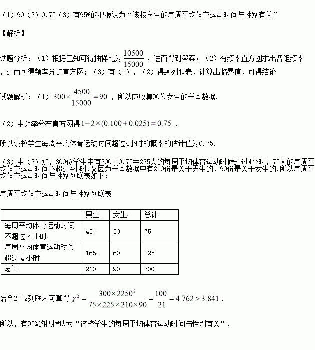 某高校共有学生15000人,其中男生10500人,女生4500人,为调查该校学生每周平均体育运动时间的情况,采用分层抽样的方法.收集300位学生每周平均体育运动时间的样本数据(单位:小时).