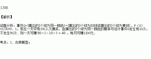 在人群流量较大的街道,有一中年人吆喝“送钱”,只见他手拿一黑色小布袋,袋中有3只黄色、3只白色的乒乓球(其体积、质地完成相同),旁边立着一块小黑板写道:摸球方法:从袋中随机摸出3个球,若摸得同一颜色的3个球,摊主送给摸球者5元钱;若摸得非同一颜色的3个球,摸球者付给摊主1元钱.假定一天中有100人次摸奖,试从概率的角度估算一下这个摊主一个月(按30天计)能赚_________________元钱.