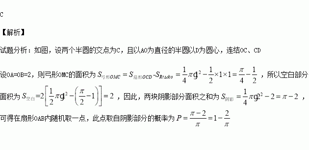 如图,在圆心角为直角的扇形OAB中,分别以OA,OB为直径作两个半圆.在扇形OAB内随机取一点,则此点取自阴影部分的概率是( ).