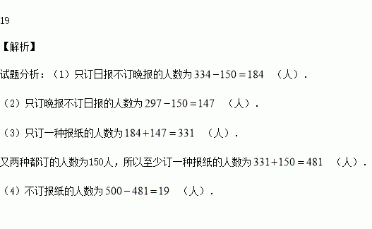 市场调查公司为了解某小区居民在阅读报纸方面的取向,抽样调查了500户居民,调查显示:订阅晨报的有334户,订阅晚报的有297户,其中两种都订阅的有150户,则两种都不订阅的有 .
