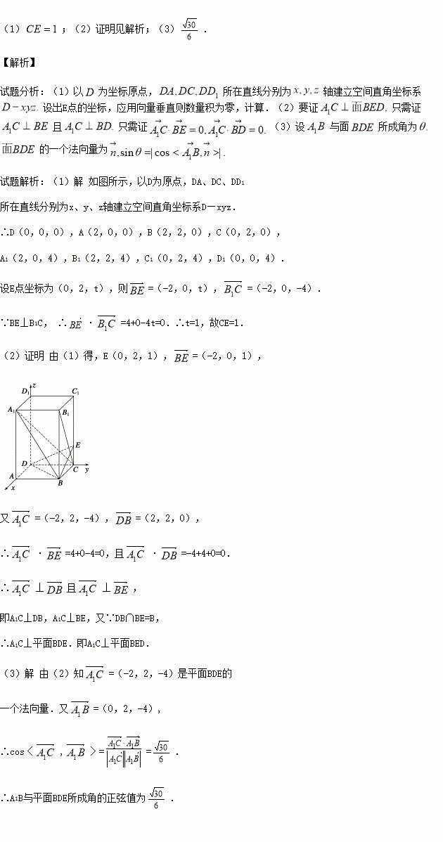 如图所示,已知长方体ABCD—A1B1C1D1中,AB=BC=2,AA1=4, E是棱CC1上的点,且BE⊥B1C.