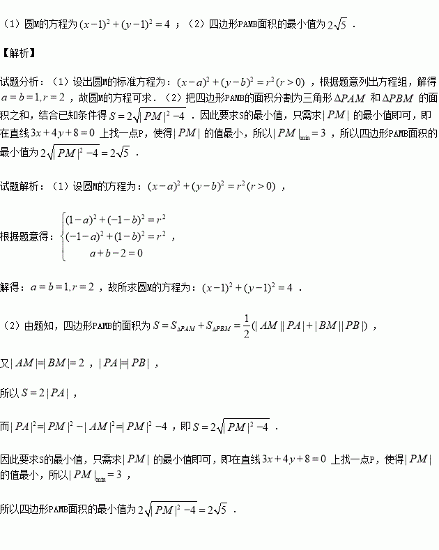 上的动点,PA,PB是圆M的两条切线,A,B为切点,求四边形PAMB面积的最小值.