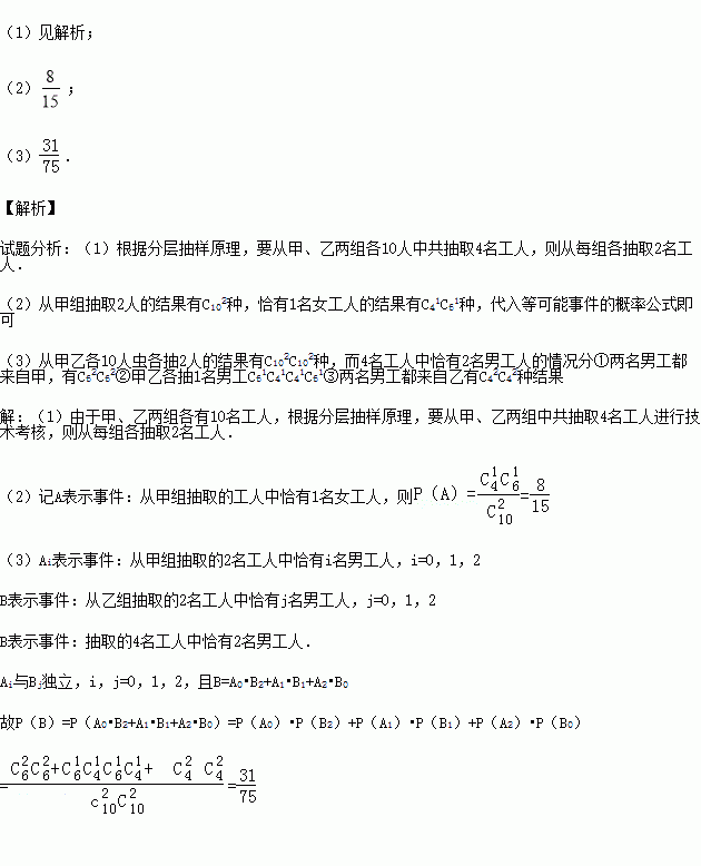 (2009•全国卷Ⅱ)某车间甲组有10名工人,其中有4名女工人;乙组有10名工人,其中有6名女工人.现采用分层抽样(层内采用不放回简单随即抽样)从甲、乙两组中共抽取4名工人进行技术考核.