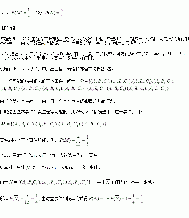 现有7名世博会志愿者,其中志愿者A1、A2、A3通晓日语,B1、B2通晓俄语,C1、C2通晓韩语。从中选出通晓日语、俄语和韩语的志愿者各1名,组成一个小组。已知每个志愿者被选中的机会均等。
