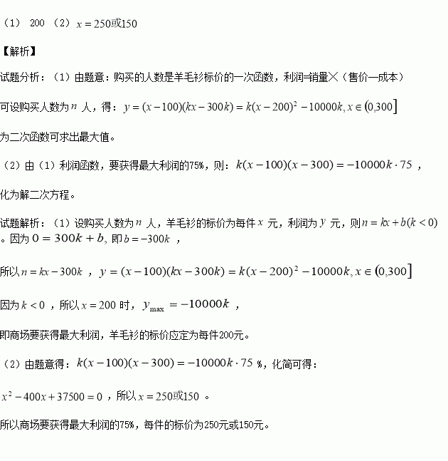 商场销售某一品牌的羊毛衫,购买的人数是羊毛衫标价的一次函数,标价越高,购买的人数越少。把购买人数为0时的最低标价称为无效价格。已知无效价格为每件300元。现在这种羊毛衫的成本价是100元/件,商场以高于成本价的相同价格(标价)出售。问: