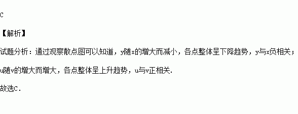 D.变量x与y负相关,u与v负相关