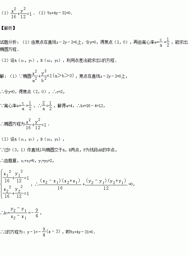 (2)过P(3,1)作直线l与椭圆交于A,B两点,P为线段AB的中点,求直线l的方程.