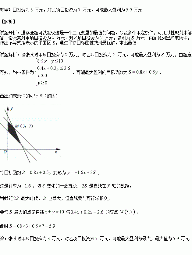 ÍòÔª.ÎÊ£ºÕÅij¶Ô¼×¡¢ÒÒÁ½¸öÏîÄ¿¸÷Ͷ×ʶàÉÙÍòÔª£¬²ÅÄÜʹ¿ÉÄܵÄÓ¯Àû×î´ó£¿²¢Çó³öÓ¯ÀûµÄ×î´óÖµ.