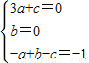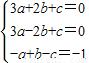 【答案】分析:求出导函数,据函数在极值点处的导数值为0,将x=±代入导函数得到的值为0;将x=-1代入f(x)等于-1,列出方程组,求出a,b,c