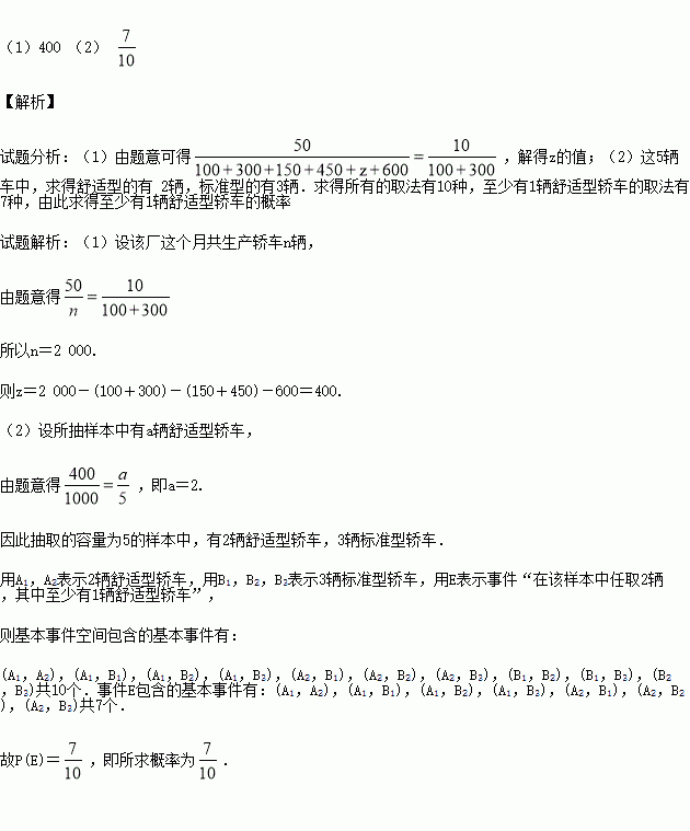 (2)用分层抽样的方法在C类轿车中抽取一个容量为5的样本.将该样本看成一个总体,从中任取2辆,求至少有1辆舒适型轿车的概率;
