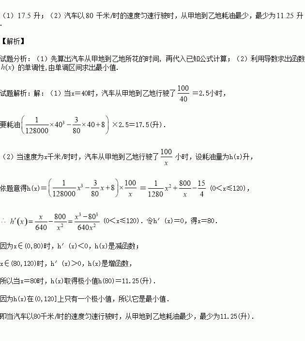(1)当汽车以40千米/时的速度匀速行驶时,从甲地到乙地要耗油多少升?