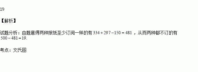 市场调查公司为了了解某小区居民在阅读报纸方面的取向,抽样调查了500户居民,调查的结果显示:订阅晨报的有334户,订阅晚报的有297户,其中两种都订的有150户,则两种都不订的有 户.