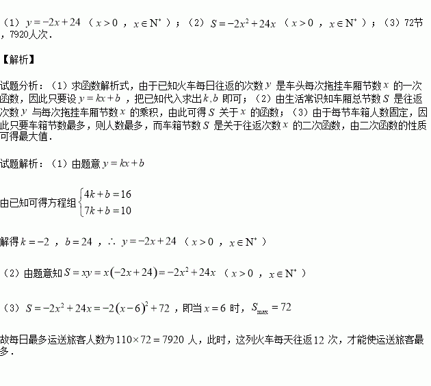 ÈË£¬Çóÿ´Î³µÍ·ÍϹҶàÉÙ½Ú³µÏá¿ÉʹÿÌìÔËË͵ÄÂÿÍÈËÊý×î¶à£¬²¢Çó³öÿÌì×î¶àÔËËÍÂÿÍÈËÊý£®