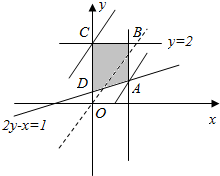 解答 解:由约束条件$\left\{\begin{array}{l}{0≤x≤1}\\{0≤y≤2}\\{2y-x≥1}\end{array}\right.$作出可行域如图,![]()
