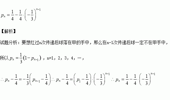 甲乙丙丁四个人做传球练习,球首先由甲传出,每个人得到球后都等概率地传给其余三个人之一,设Pn表示经过n次传递后球回到甲手中的概率,则Pn=_________(用含n的式子表示).