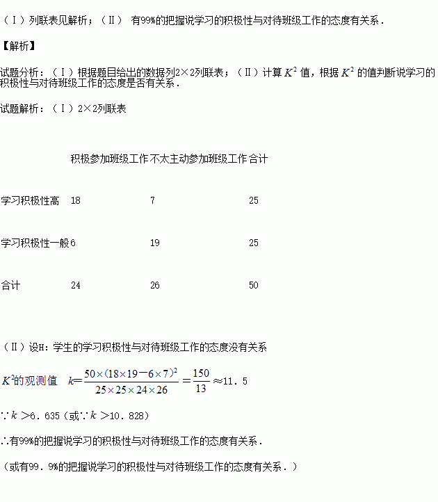 (Ⅱ)试运用独立性检验的思想方法分析:学生的学习积极性与对待班级工作的态度是否有关系?
