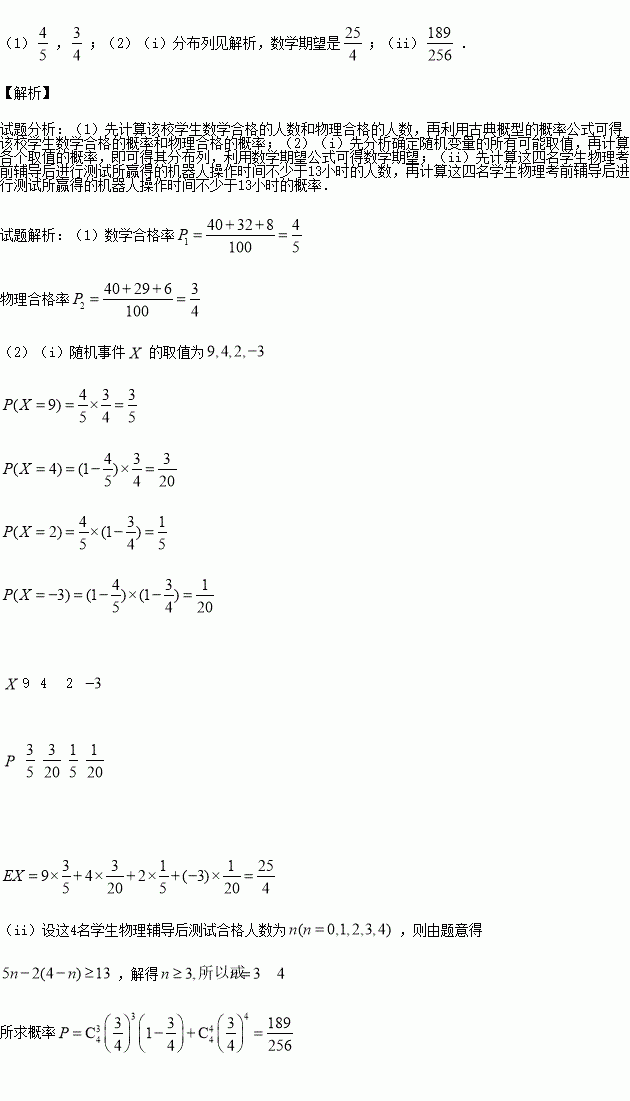 (2)设数学合格一人可以赢得4小时机器人操作时间,不合格一人则减少1小时机器人操作时间;物理合格一人可以赢得5小时机器人操作时间,不合格一人则减少2小时机器人操作时间.在(1)的前提下,