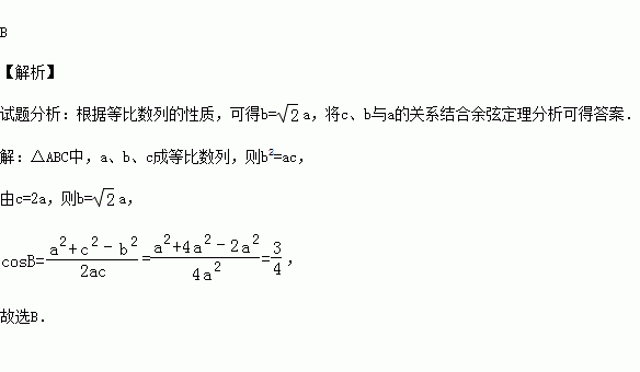 (2015•秦安县一模)△ABC的内角A、B、C的对边分别为a、b、c,若a、b、c成等比数列,且c=2a,则cosB=( )