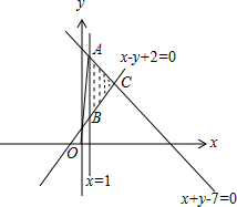 解答 解:由约束条件$\left\{\begin{array}{l}{x-y+2≤0}\\{x+y-7≤0}\\{x≥1}\end{array}\right.$作差可行域如图,![]()